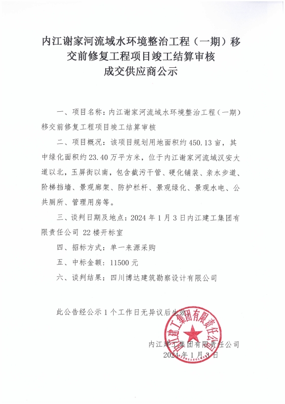內(nèi)江謝家河流域水環(huán)境整治工程(一期)移交前修復工程項目竣工結算審核 成交供應商公示
