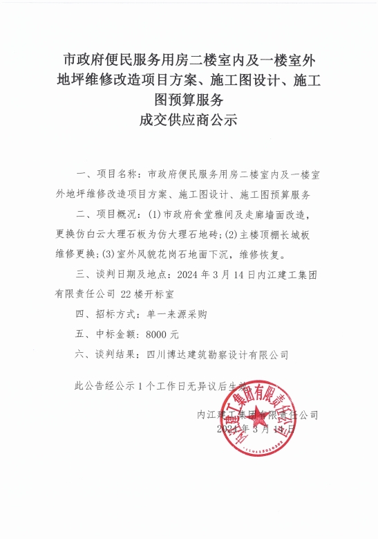 市政府便民服務用房二樓室內及一樓室外地坪維修改造項目方案、施工圖設計、施工圖預算服務 成交供應商公示