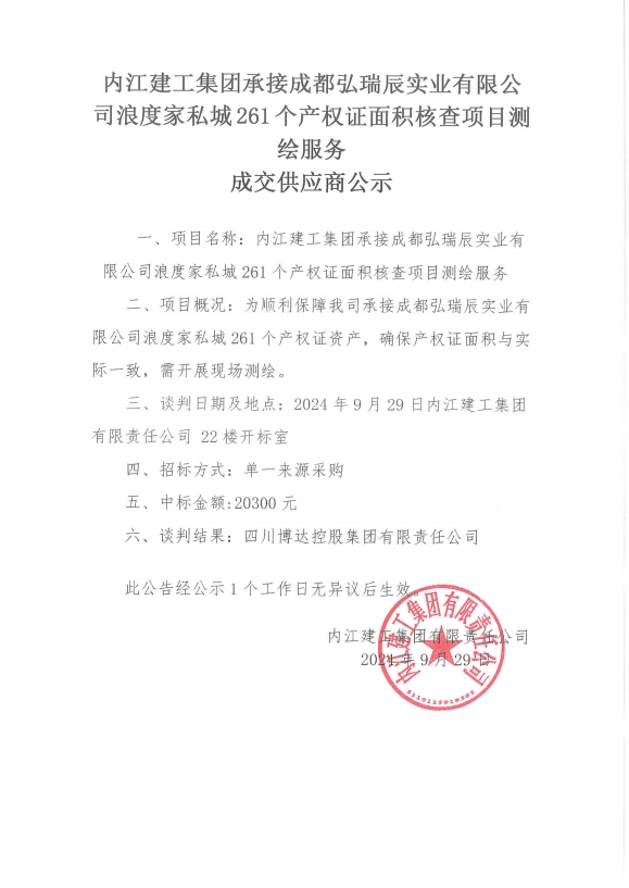 內(nèi)江建工集團承接成都弘瑞辰實業(yè)有限公司浪度家私城261個產(chǎn)權(quán)證面積核查項目測繪服務(wù) 成交供應(yīng)商公示