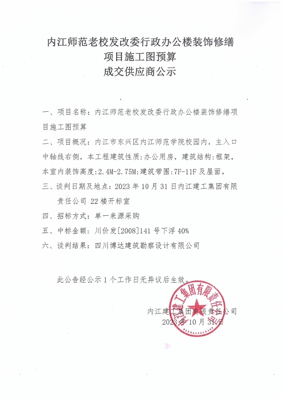內(nèi)江師范老校發(fā)改委行政辦公樓裝飾修繕項目施工圖預(yù)算 成交供應(yīng)商公示