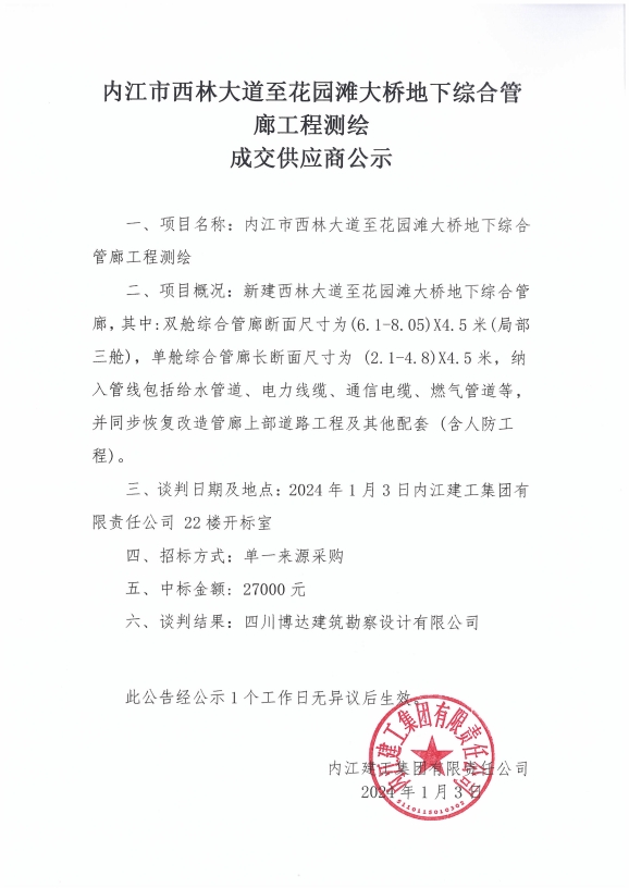 內(nèi)江市西林大道至花園灘大橋地下綜合管廊工程測繪 成交供應(yīng)商公示