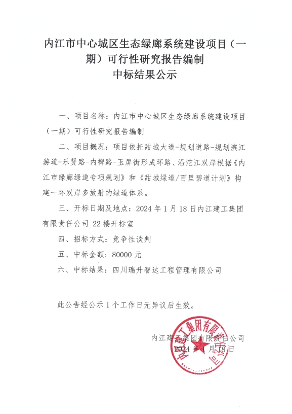 內(nèi)江市中心城區(qū)生態(tài)綠廊系統(tǒng)建設(shè)項(xiàng)目(一期)可行性研究報(bào)告編制 中標(biāo)結(jié)果公示