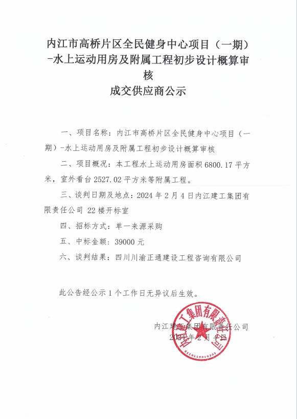 內(nèi)江市高橋片區(qū)全民健身中心項(xiàng)目(一期)-水上運(yùn)動用房及附屬工程初步設(shè)計(jì)概算審核 成交供應(yīng)商公示