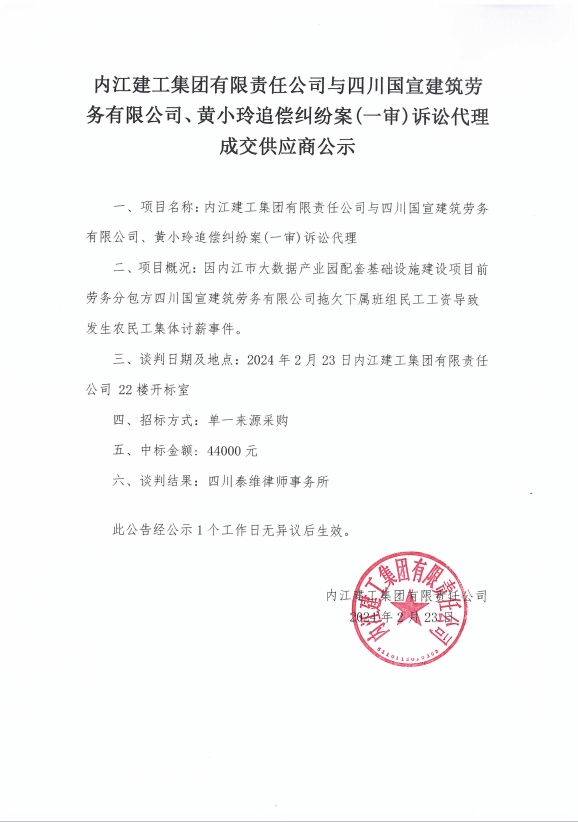 內(nèi)江建工集團(tuán)有限責(zé)任公司與四川國宣建筑勞務(wù)有限公司、黃小玲追償糾紛案(一審)訴訟代理 成交供應(yīng)商公示