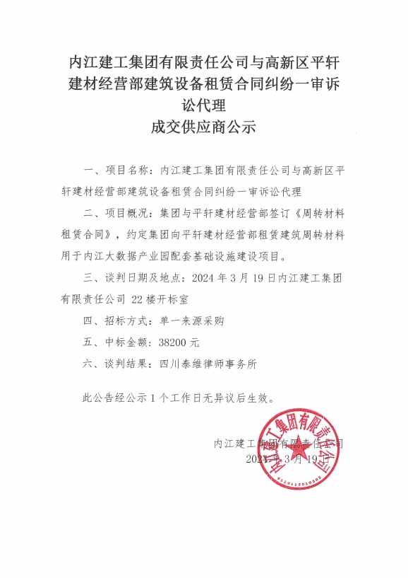 內(nèi)江建工集團(tuán)有限責(zé)任公司與高新區(qū)平軒建材經(jīng)營部建筑設(shè)備租賃合同糾紛一審訴訟代理 成交供應(yīng)商公示