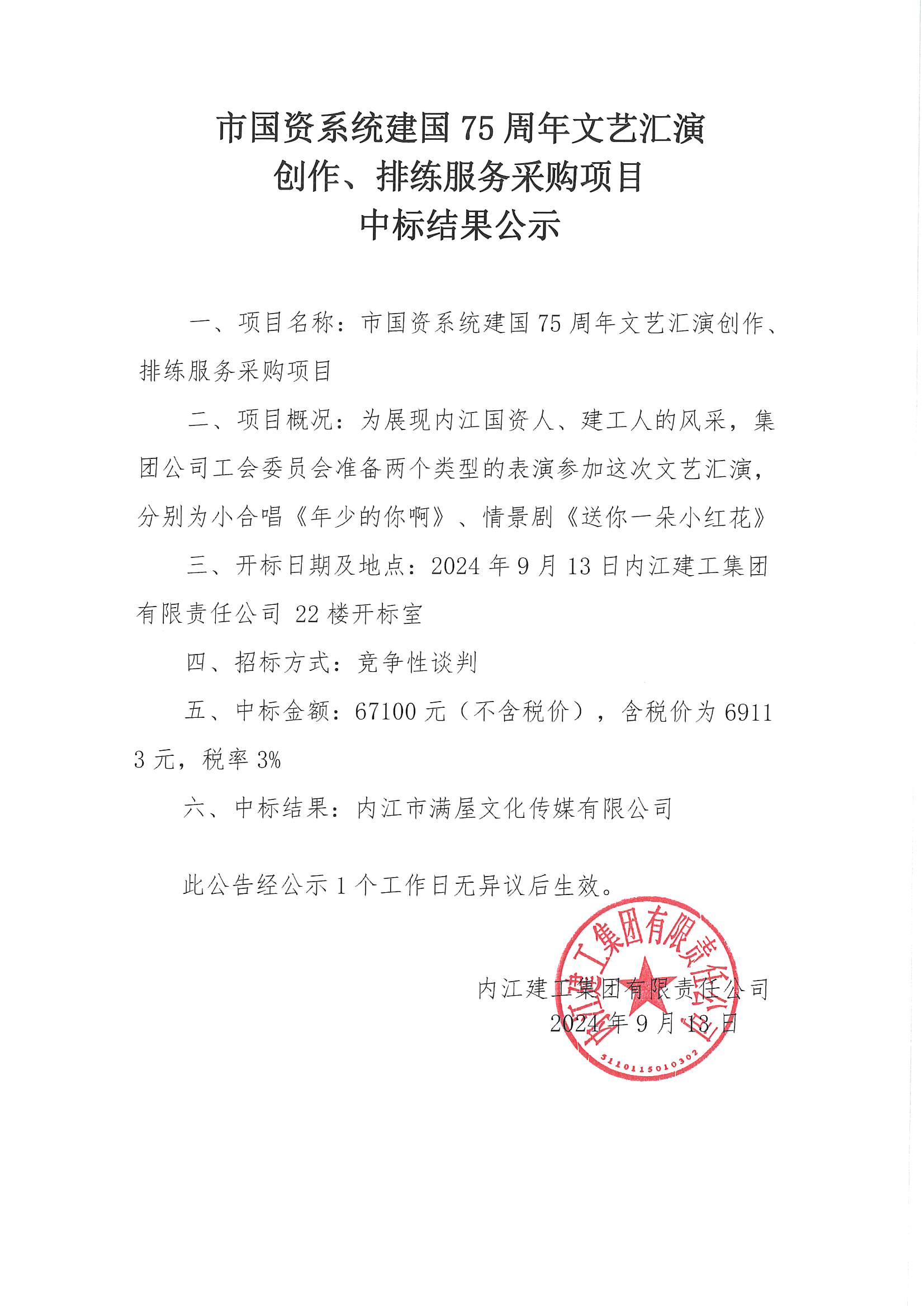 市國資系統(tǒng)建國75周年文藝匯演、創(chuàng)作、排練服務(wù)采購項目中標(biāo)結(jié)果公示
