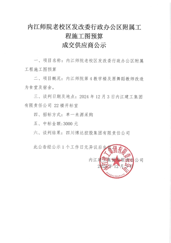 內江師院老校區(qū)發(fā)改委行政辦公區(qū)附屬工程施工圖預算 成交供應商公示